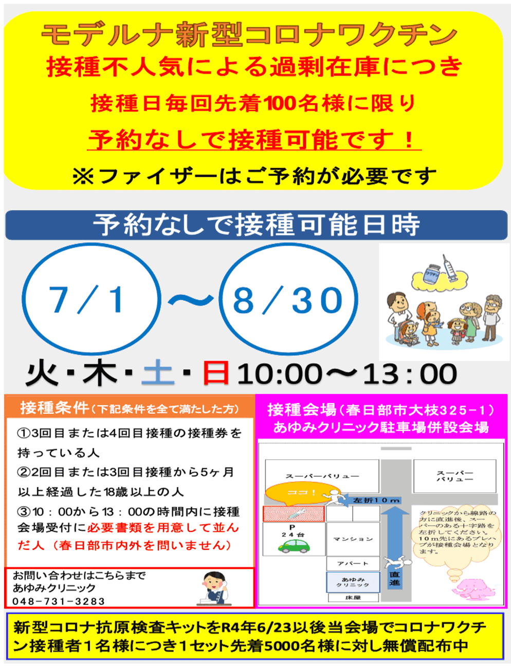 | 接種時間・曜日 | 通常の診療時間:ファイザー・武田 ご希望を受付窓口でお申し出ください 土曜午後・日祝:ファイザーのみの接種となります |